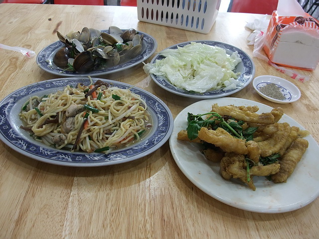 等待蚵仔炸的同時,其它菜皆已上桌,與魔女各點:高麗菜、炒蛤仔、炒麵、花枝酥。花枝酥的口感很棒很鮮,強推這一道菜!