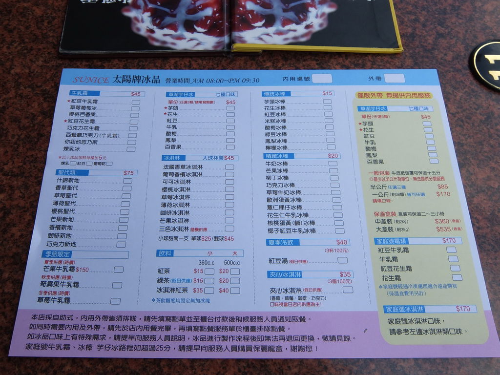 MENU:愛吃的紅豆牛奶霜、草湖芋頭冰,已經漲了$5,來到$45的關卡(總不會跟武廟肉圓一樣,過些日子,也踏上$50吧