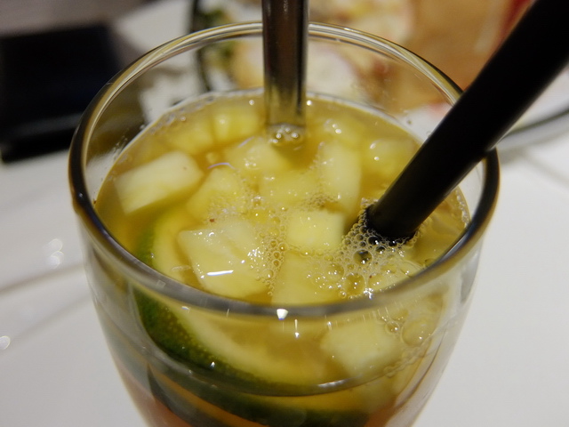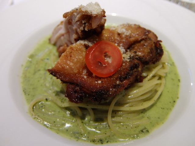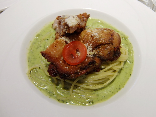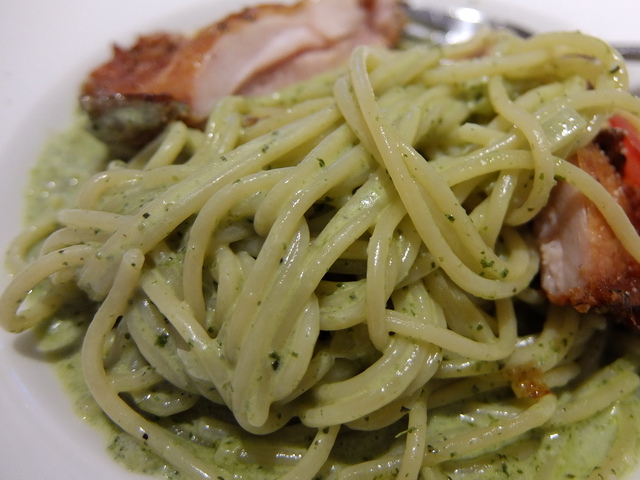 青醬奶油雞腿麵:那醬汁、麵條、疊上的雞腿肉,真得是出乎意料外的美味!青醬的鹹稠度,麵條軟Q偏內硬,是葉子喜歡的狀態;那雞腿肉,炸得夠酥脆,口感極好,較為可惜一點,是肉汁不夠,不然就真得是很完美的一份鹹食餐點![]()