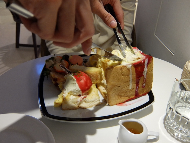 。沾著冰淇淋、卡士達醬的吐司條,真得好吃,甜度還好(若不夠甜,還有蜂蜜可加,要多甜可以多甜!);而外層的吐司,除非肚子餓,不然,實在比吐司條難入口......換句話說,主角就是裡頭的吐司條、冰淇淋、卡士達醬!
