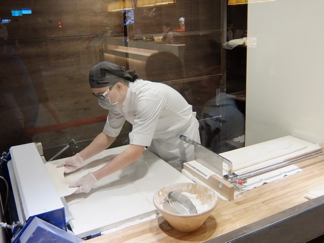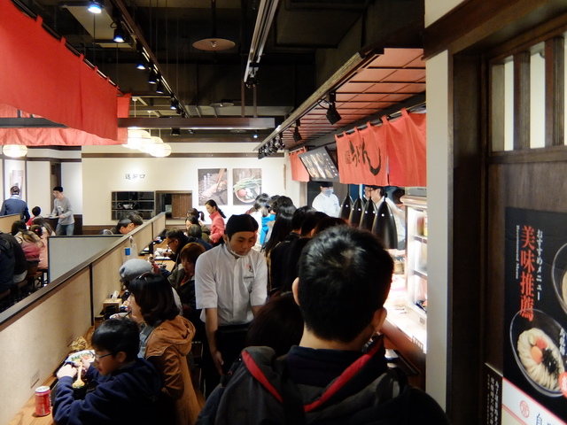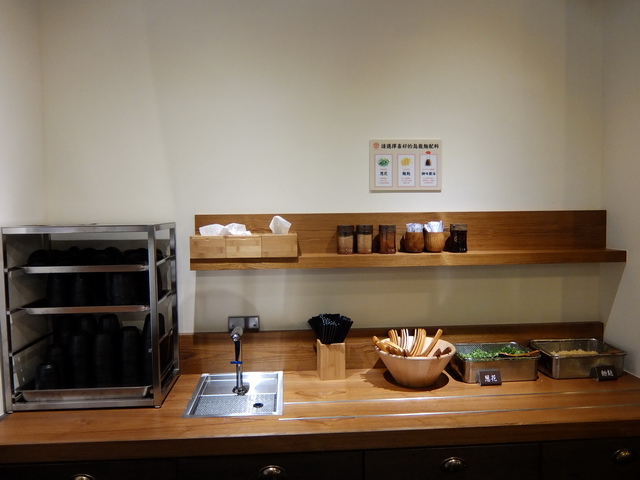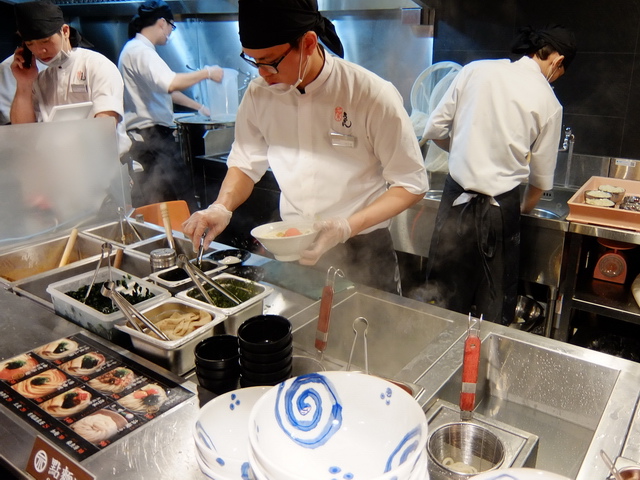 排隊 -> 取餐盤 -> 小菜 -> 炸物 -> 烏龍麵口味 -> 結帳 (不可刷卡),不可刷卡的理由是(為了讓餐點更美味),這串字語,頗類似一風堂(10%服務費的解釋),葉子都認為是很鳥的藉口啦.....。BTW,葉子建議不要選擇取餐走道旁的用餐區域,很擠.........