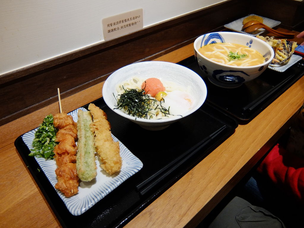 葉子&魔女的午餐:明太子烏龍麵、湯咖哩烏龍麵、炸物(炸蝦、雞塊、竹輪、地瓜、蔬菜&咖哩可樂餅)
