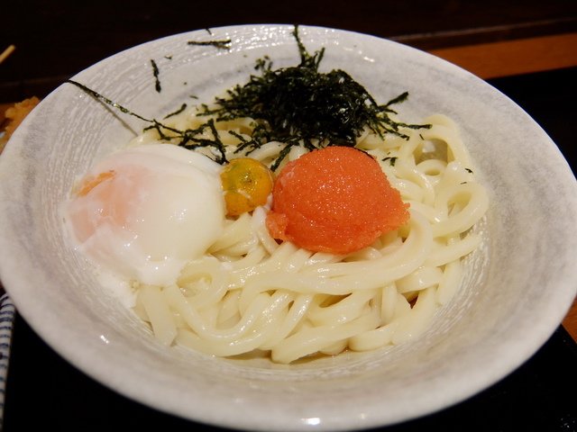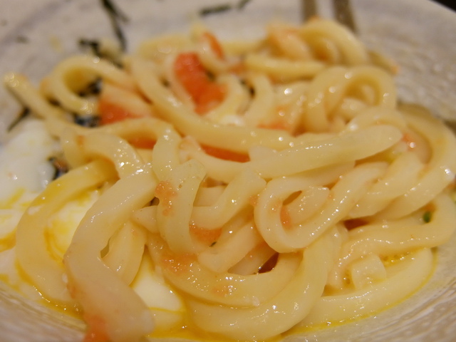 明太子烏龍麵:麵條可選冷熱,烏龍麵部分,葉子習慣吃熱的。先單吃麵條,果然好味,是散發麵香又有Q勁的烏龍麵,值得了!再來,把溫泉蛋、明太子拌勻後,享受混著蛋黃、明太子的鹹香滋味,更是滑溜滑溜地美味~