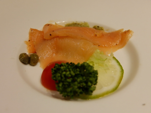 煙燻鮭魚:有點淒涼的片薄鮭魚,相比於烤田螺,還真得弱掉(雖然知道看MENU照片不準,但那拍得厚又份量多的煙燻鮭魚,與實際還真得差很大 -> 魔女:主菜還沒上,我都覺得西堤的整套SET都比這裡誠意多囉!)