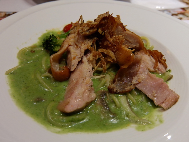 羅勒雞柳青醬麵:上一回,於Dazzling cafe吃到的青醬奶油雞腿麵,印象好,看到天母洋蔥也有此類似餐點,就點看看,互相比較一下。Mr. Onion略輸Dazzling cafe,麵條與青醬不差,就是上頭的雞肉,比較乾澀,少了肉汁的美味~若與魔女的鴨胸相比,葉子較建議選擇鴨胸,當然,義大利麵亦可,端看自己選擇囉~