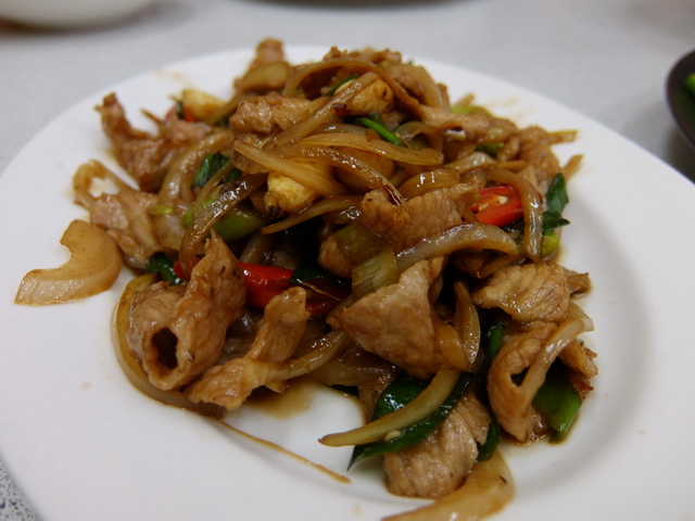 蔥爆松阪豬肉:頗邪惡的一道菜,香氣四溢,引人胃口,不多吃兩碗飯,真得對不住它!豬肉炒得入味又脆Q,搭上爆香後的洋蔥、辣椒等醬汁配料,一整個下飯!