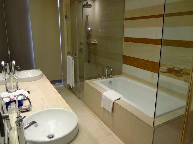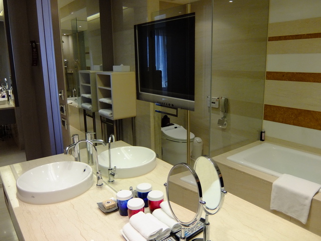 衛浴區,空間很大,除了淋浴區外,還有浴缸(可泡澡),當然,不用覺得無聊,正對著浴缸的盥洗區,有電視哩!