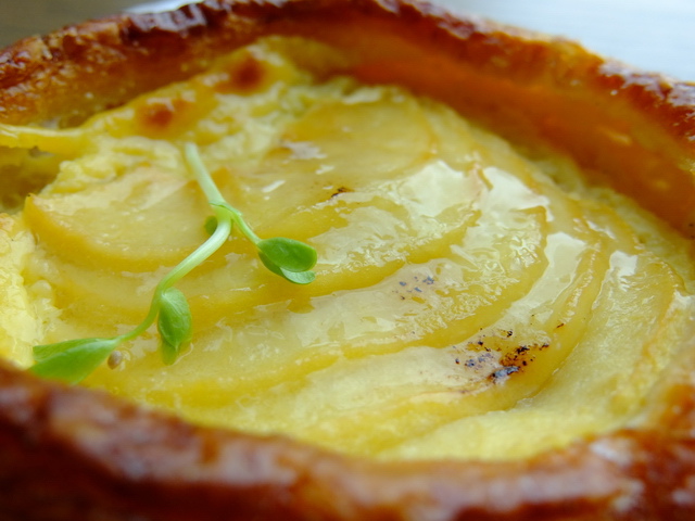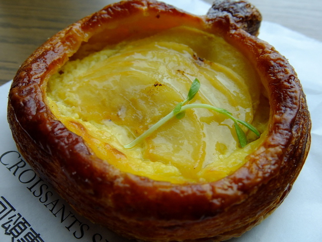 法式蘋果可頌:外層的酥脆,挾著蘋果卡士達醬內層的酸甜滋味,可是讓葉子回味多次,有時會先帶回家冰著,冰著吃的滋味也不差喲!