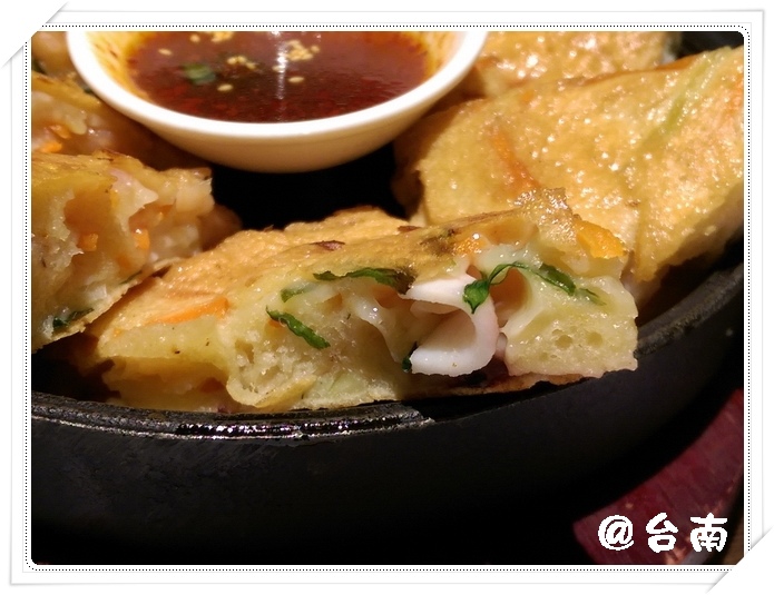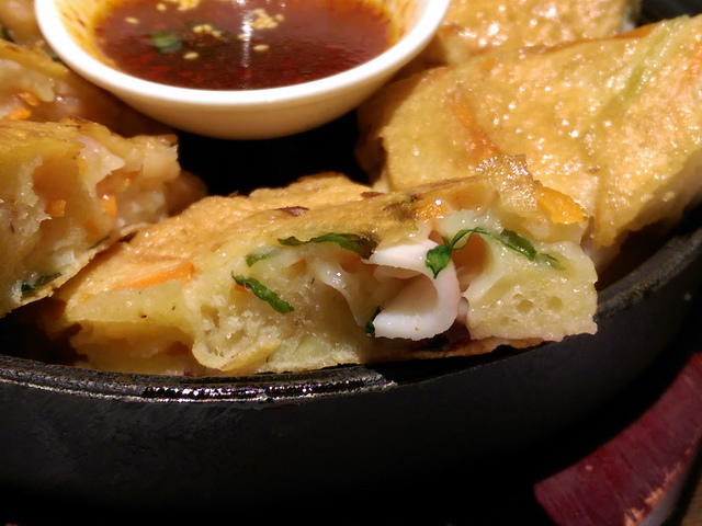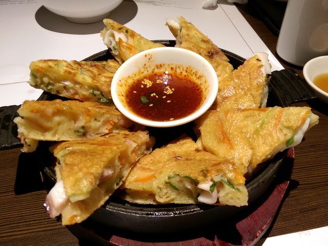 人氣煎餅‧綜合海鮮煎餅:可選厚薄,葉子選擇厚片海鮮煎餅,過然沒讓人失望。此厚片海鮮煎餅,算是初訪涓豆腐,最優的一品料理,另一品則為嫩豆腐煲!