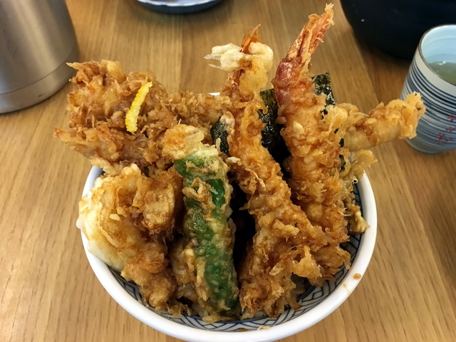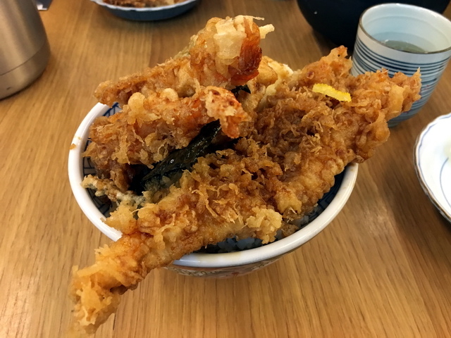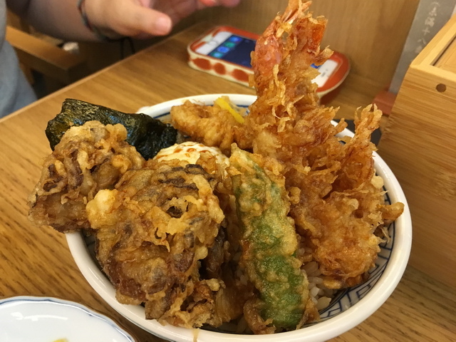 上天丼:穴子魚改成了鱧魚,其餘都相同,是為上天丼。