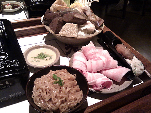 酸菜白肉鍋:火鍋部分,除了湯鍋、沾醬不同外,其附餐相同(蔬菜盤、肉、魚漿、飯or麵),很豐富的火鍋餐飲。