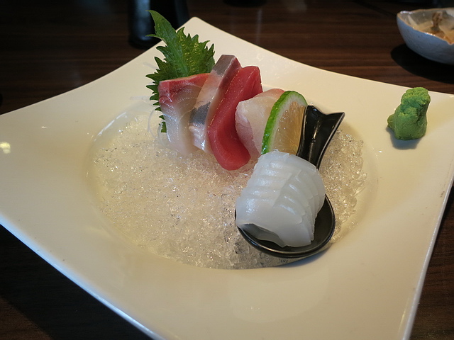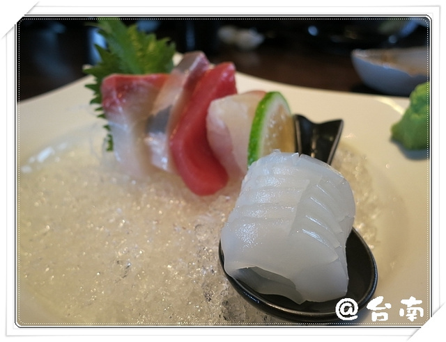 綜合刺身:有軟絲、鮪魚、鯛魚、海鱺等,魚生鮮度沒失色,但若能有甜蝦、干貝混搭,會更有特色