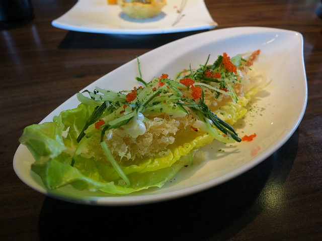 炸蝦蘿蔓捲:開胃的鮑魚冷豆腐後,這品生菜炸蝦捲是最棒的一道,炸蝦狀態恰好,外層麵衣酥脆,內層蝦肉緊實有彈性!外頭搭著蝦卵、小黃瓜、美奶滋,又是一股清爽的味道層次。