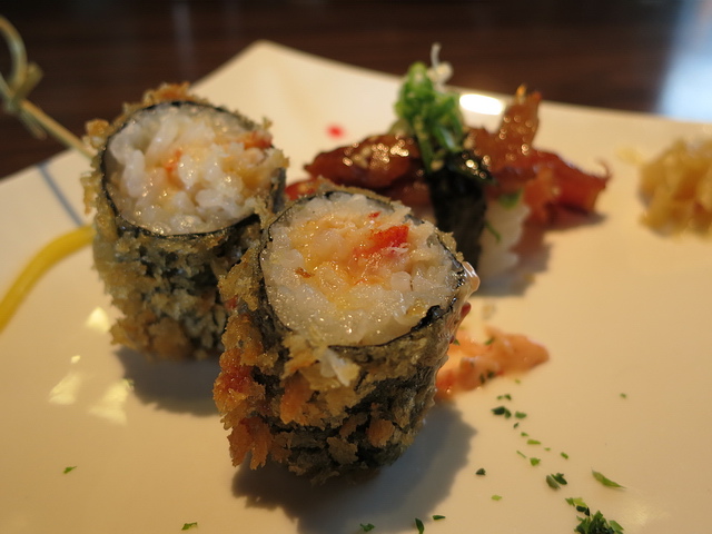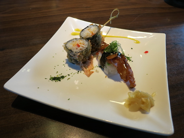 炸壽司卷、松阪豬肉握壽司:創意的炸壽司捲,感覺還不錯(新鮮感);松阪豬肉部分,有點過鹹,且豬肉吃起來,味道有點腥!