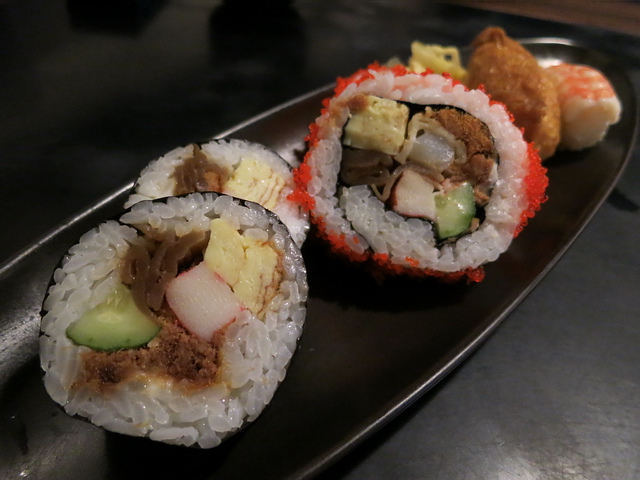綜合壽司:四個花壽司 + 豆皮 + 鮮蝦飯糰握,花壽司不錯吃,豆皮、蝦飯糰就很一般台日料的水準。基本上,可以飽肚又不太差的選擇啦